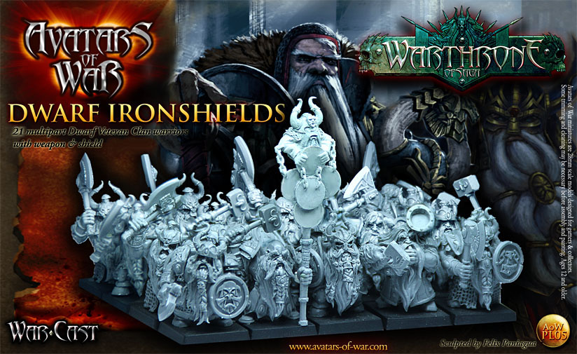 The Avatars of War Dwarf Ironshields blister pack contains 21 Dwarf Veteran Clan Warrior models armed with hand weapons and shields.